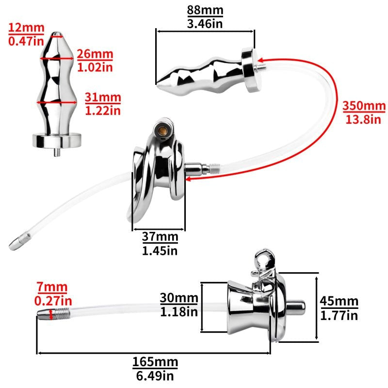 Premium dual-function 304 stainless steel chastity device featuring adjustable ring sizes, integrated enema system, and detachable urethral tube. Includes medium-sized butt plug (10.9 cm x 3.1 cm) and customisable cage chamber (4.5 cm x 3.7 cm) for secure, comfortable extended wear.