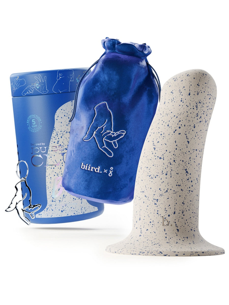 The Biird Boo dildo delivers intense fullness without excessive length, featuring a thick, soft silicone body and strong suction base. Ideal for solo or strap-on play, it comes with exclusive Jouissance Club accessories.