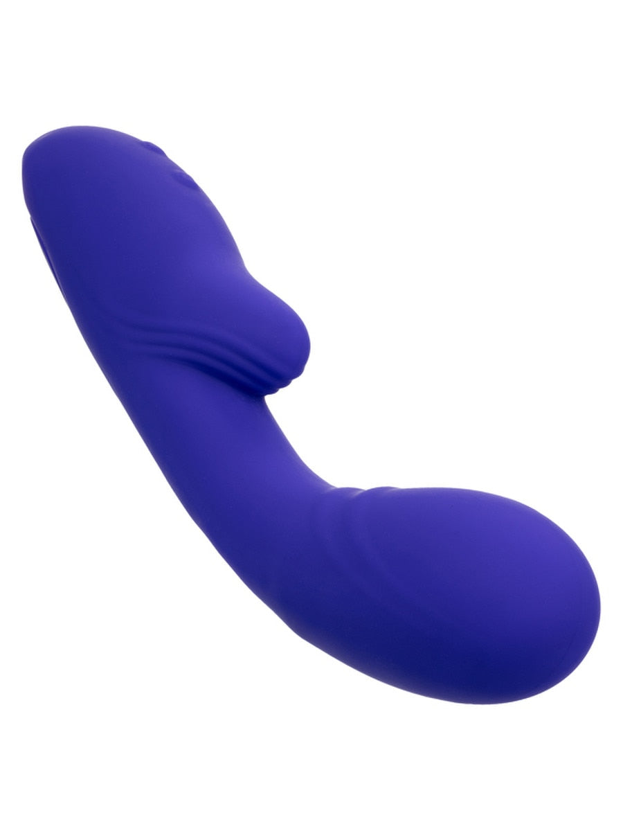 CalExotics Rumbler Rumble G is a 9-inch rabbit vibrator with dual motors and 10 vibration functions. Made from body-safe silicone, it features a rippled shaft and teaser, independent controls, and IPX7 waterproofing. The USB-C rechargeable battery runs up to 80 minutes and resumes your last setting with its built-in memory chip.
