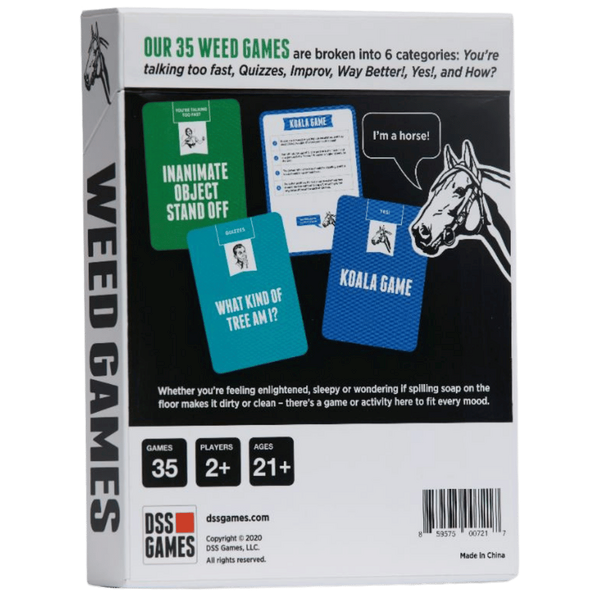 Creative Conceptions Weed Novelty Party Games bundle 35 cannabis-inspired challenges into one collection for groups of 2+ players aged 21 and up. This novelty party gift spans six game categories—You're Talking Too Fast, Quizzes, How?, Yes!, Way Better, and Improv—each offering multiple variations that test creativity, reaction speed, and ability to function under pressure. The stoner culture theming means prompts reference munchies, paranoia, time distortion, and other cannabis stereotypes that land humorously even for sober players.