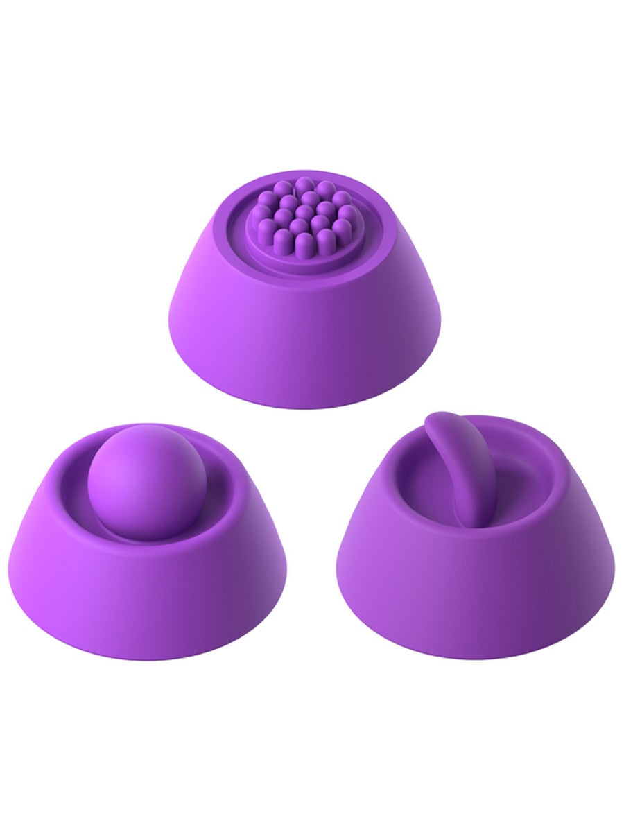 The FlickerFlow system includes three interchangeable attachments that accommodate different anatomical preferences and sensitivity levels. Each attachment provides varied texture and contact approaches for personalised external stimulation.