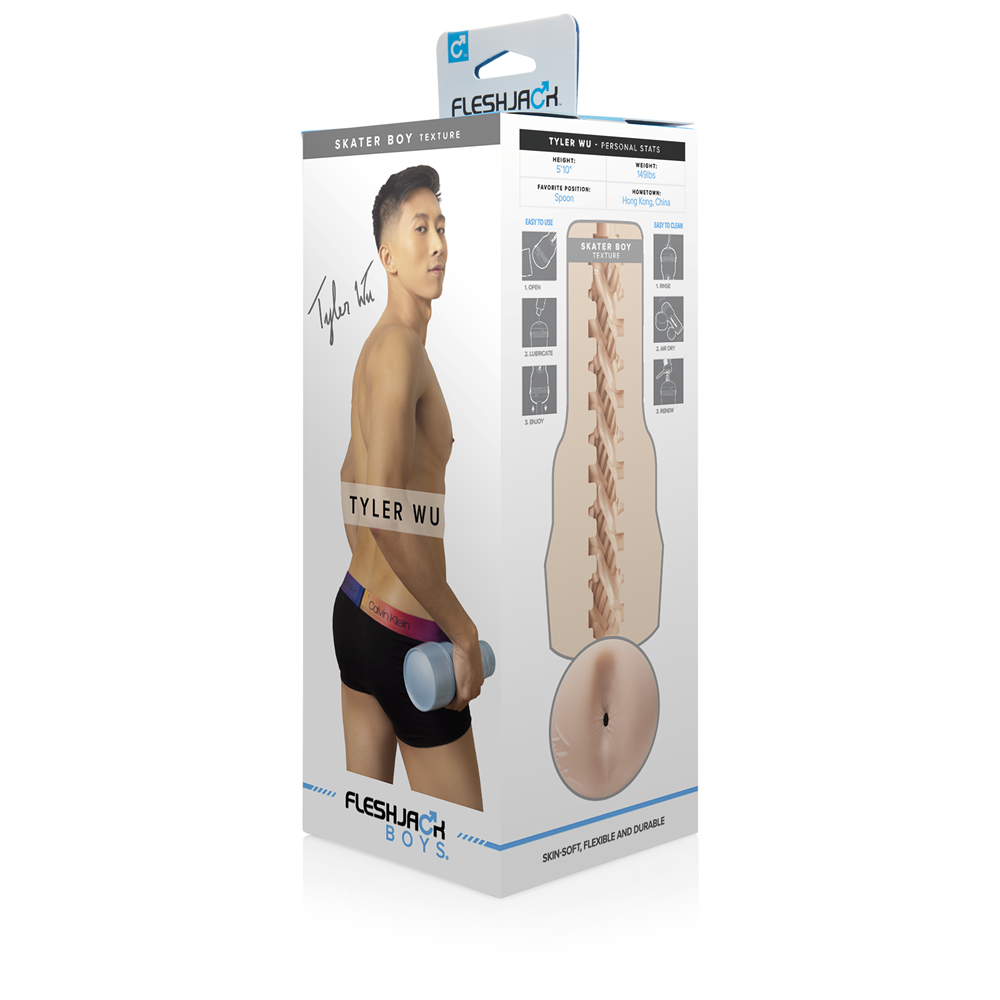Fleshjack Boys Tyler Wu Skater Boy Masturbator is a male stroker designed from the actual body casting of adult performer Tyler Wu. The Superskin sleeve features the exclusive Skater Boy texture pattern, offering a realistic and intense experience in a distinctive powder blue case.