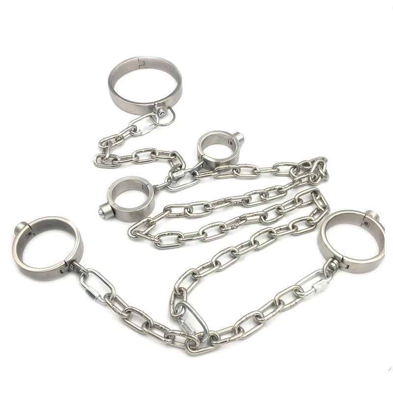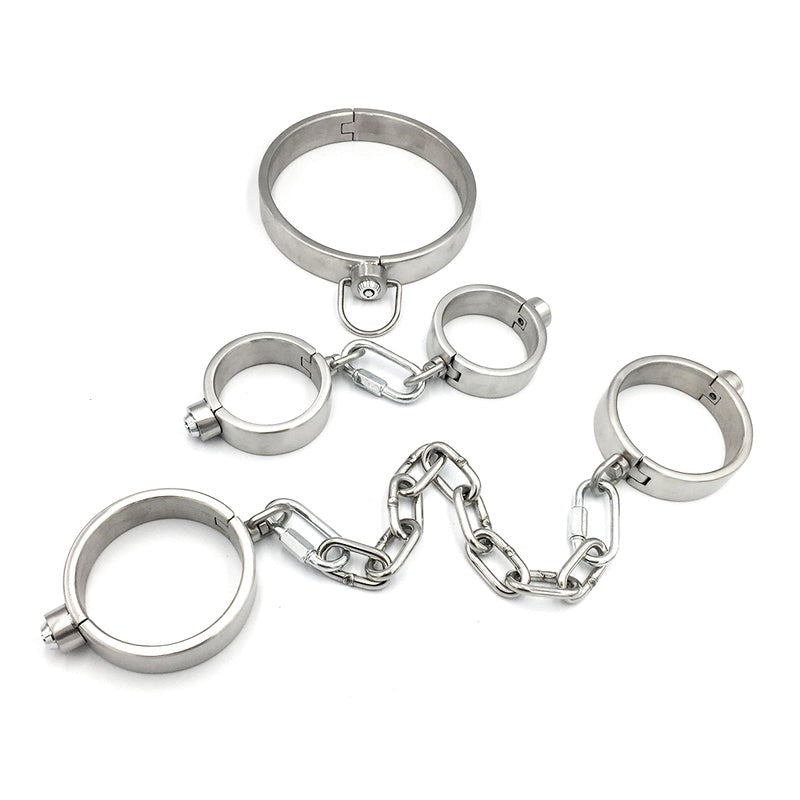 Professional-grade stainless steel BDSM restraint kit featuring innovative press key locks, anatomical sizing, and integrated remote control vibrator. Military-grade construction weighing 565g-1048g delivers secure, comfortable restraint for experienced practitioners.