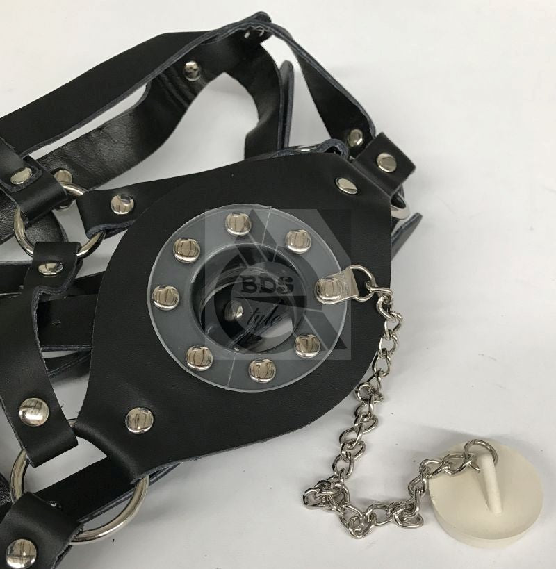 The BDStyle Leather Head Harness Gag with Stopper is a high-quality BDSM restraint featuring adjustable leather straps, secure gag stopper, and durable hardware. Crafted from premium leather with comfort-focused design for safe, consensual power play experiences.