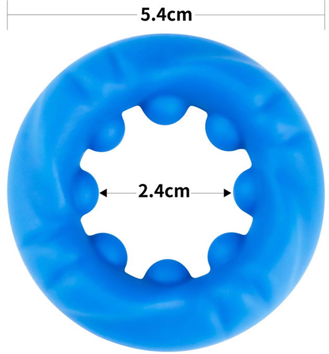 The device features carefully calculated dimensions, with a 2.4 cm inner diameter that expands to accommodate individual anatomy while maintaining appropriate tension. The 5.4 cm outer diameter provides substantial surface area for the specialized texture elements while maintaining a professional profile.