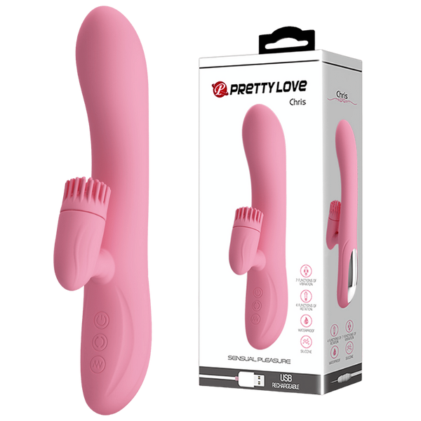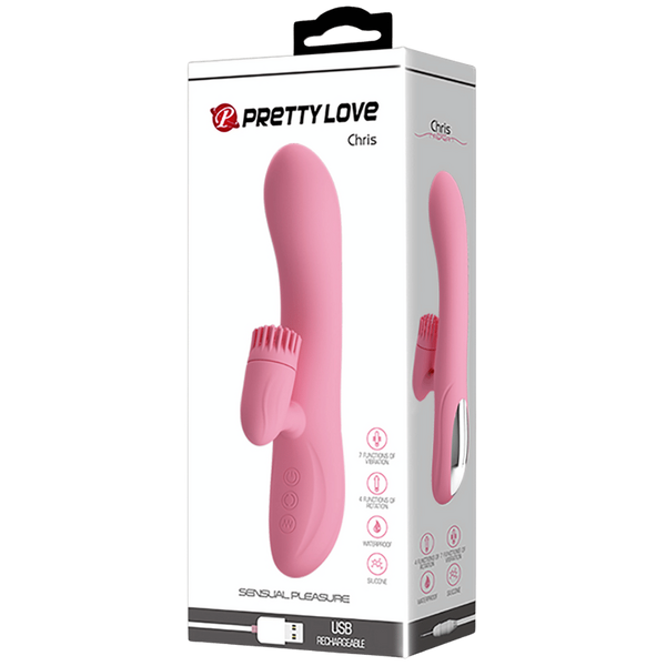 Pretty Love Chris Rotating Tongue Rabbit Vibrator is a dual-stimulation vibrator combining a rotating tongue stimulator with a curved G-spot shaft. The lifelike silicone design delivers seven vibration patterns across both the clitoral and internal stimulators, creating layered sensations for solo or partnered play.