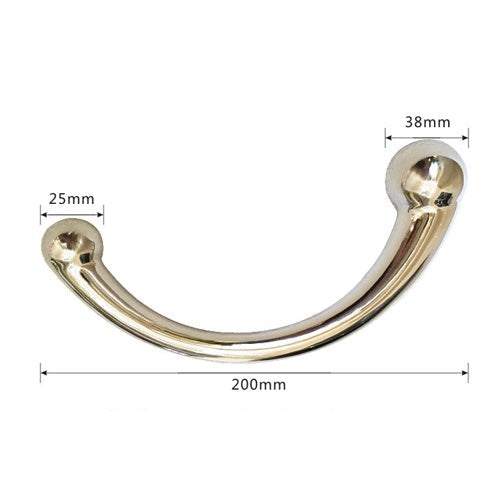 Premium stainless steel pleasure wand featuring dual-ended design with 2.1cm and 3.2cm balls for targeted G-spot or P-spot stimulation. Ergonomically curved 16cm length delivers precise pressure control and intense sensations. Body-safe, non-porous construction ensures hygiene and durability.