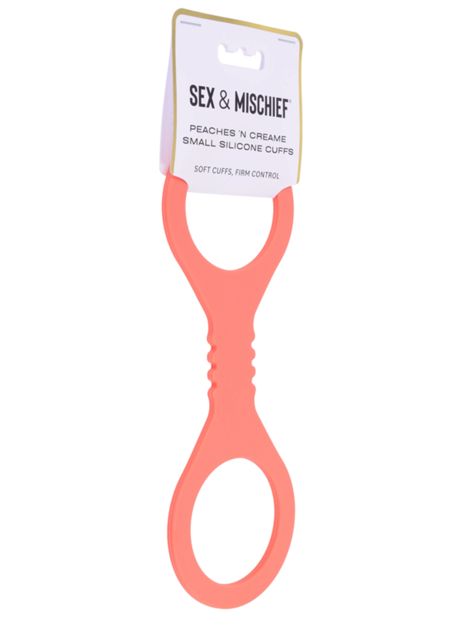 The Sex and Mischief Peaches n CreaMe Silicone Cuffs slip on like peach-toned second skin—small pair for wrists (9.5 inches long, 2.5-inch inner diameter), large for ankles (11 inches long, 3-inch inner diameter)—stretching snug without buckles or metal. One hundred percent body-safe silicone flexes with every tug yet grips firm enough to hold poses. Fully waterproof, lightweight, and bruise-free, they invite wet play or travel without bulk. Link the small and large together through their seamless loops for instant hog-tie restraint. Perfect for beginners testing bondage or veterans craving quick, mark-free control. As sleek bondage and fetish toys, the cuffs blend bedroom flirt with dungeon function—stretch them on solo for self-binding experiments or let a partner snap them shut. Skin stays smooth, no red rings, just peachy surrender.