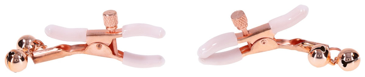 Sex and Mischief Peaches n CreaMe Bell Nipple Clamps feature soft rubber tips and rose gold bells. With adjustable tension for tailored pressure, they combine elegant design and audible teasing for nipple play that’s both sensual and striking.