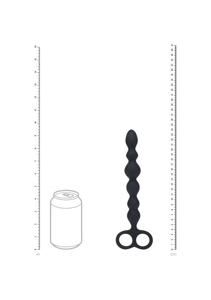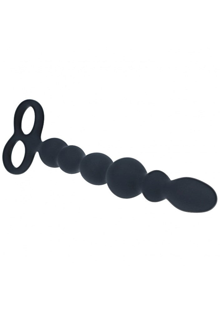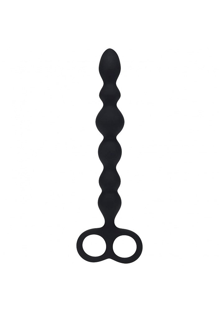 Silicone anal probe with smooth bead pattern and dual-loop base for progressive exploration and secure retrieval during solo or partnered play.