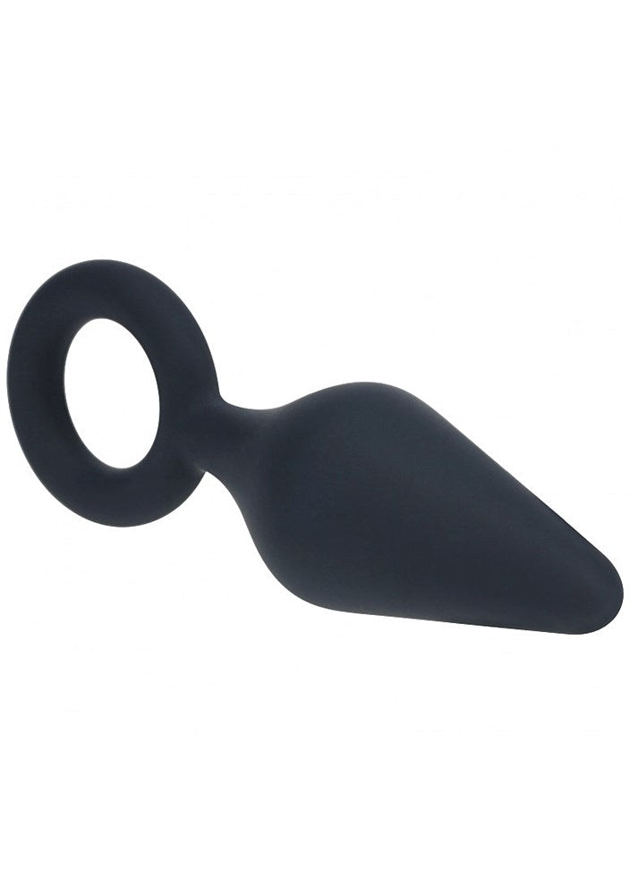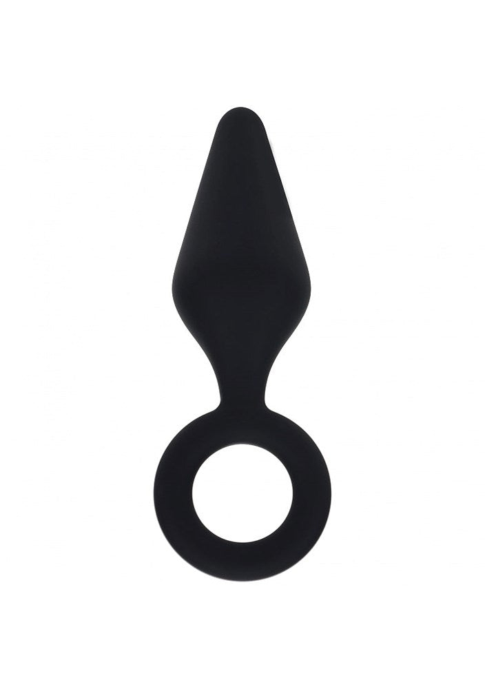 Silicone anal plug with tapered tip and loop handle for controlled insertion and confident retrieval during solo or partnered play.