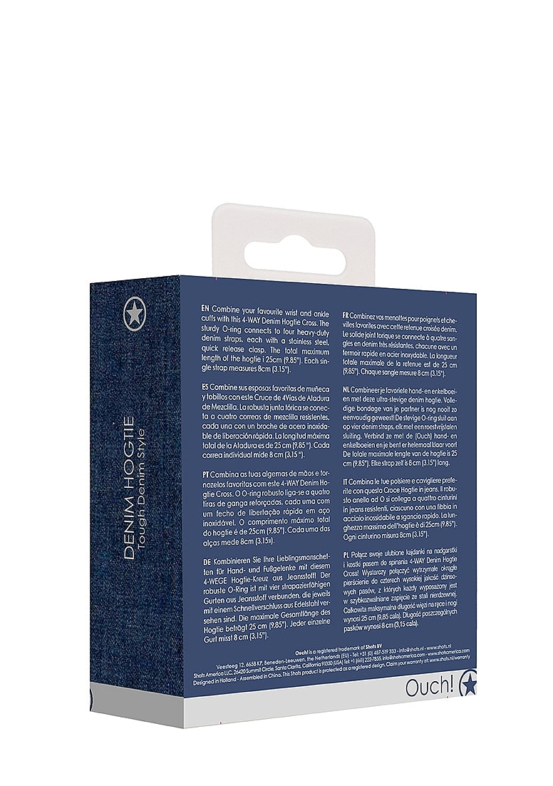 Shots Toys Roughend Denim Style Fetish Play Hogtie is a four-way restraint connector designed for full-body bondage play. The sturdy central O-ring links four heavy-duty denim straps, each fitted with quick-release stainless steel clasps. Clip it onto your existing wrist and ankle cuffs for instant full-body control and submission positioning.