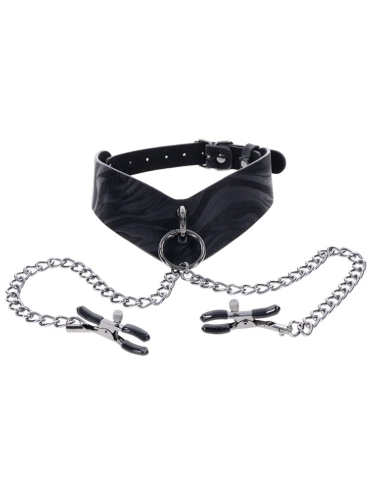The Sport sheets Velvet Noir Collar and Removable Clamps is a sophisticated and versatile piece designed to elevate your sensual play. Crafted with a sleek marbled finish and hematite-plated hardware, this angled collar commands attention and control, making it a captivating addition to your collection of intimate accessories. Featuring a removable ring and a single metal chain that connects to adjustable nipple clamps, this set offers a tantalizing blend of dominance and exploration, allowing you to customize your experience to suit your desires.